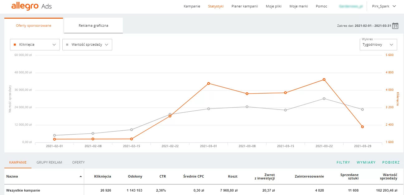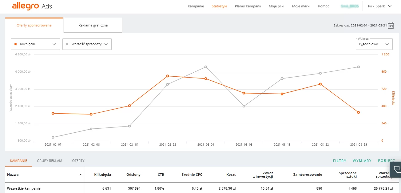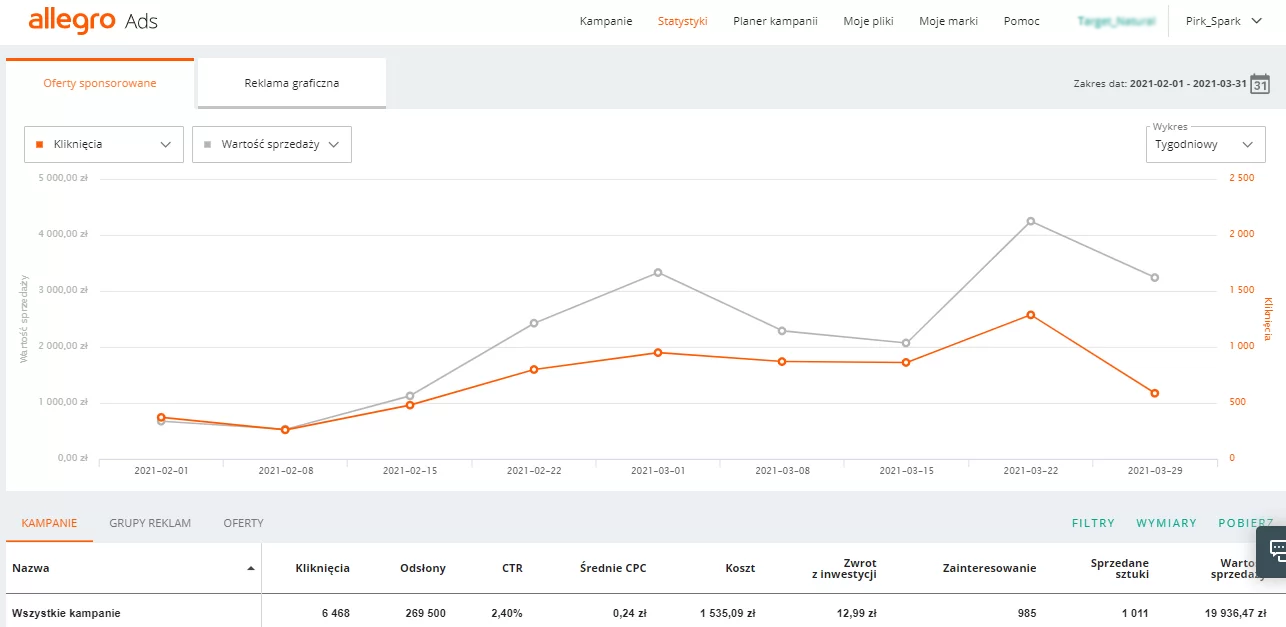 Drugim istotnym celem Klienta było generowanie wysokich wartości sprzedaży przy pomocy narzędzia Allegro Ads. Oczekiwany zwrot z inwestycji miał utrzymywać się na poziomie minimum 10 zł.