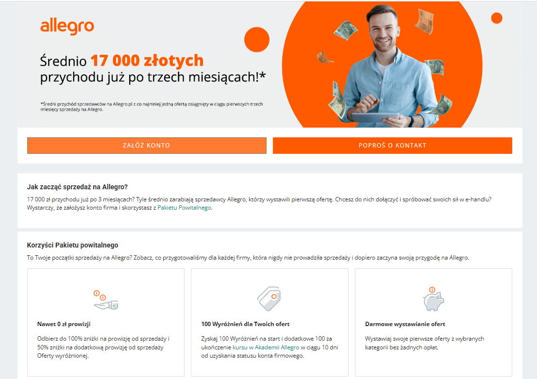 - W porównaniu z konkurencyjnymi platformami sprzedażowymi portal wyróżnia się przejrzystą procedurą rejestracji. Proces zakładania konta jest banalnie prosty i nie wymaga kontaktu z dedykowanym konsultantem. To oznacza, że w przypadku Allegro można błyskawiczne rozpocząć sprzedaż.