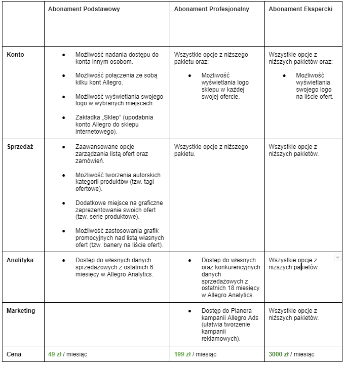 Obecnie Allegro oferuje sprzedawcom aż 3 różne abonamenty, które różnią się od siebie ceną i dostępnymi funkcjonalnościami. Taki podział jest bardzo korzystny z perspektywy biznesu, ponieważ pozwala na dostosowanie do własnych potrzeb oraz zminimalizowanie ponoszonych z tego tytułu kosztów.