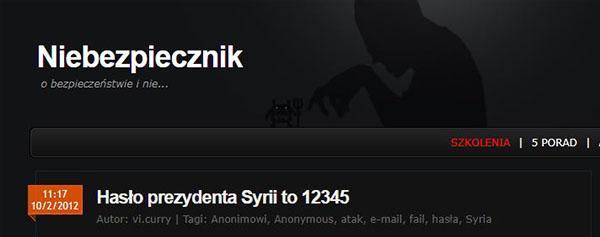 Żeby nie było nam smutno, że tylko w Polsce są ludzie niekompetentni – hasło do skrzynki prezydenta Syrii to 12345. Jak podaje niebezpiecznik.pl, jest to jedno z najpopularniejszych haseł na świecie, ale nie w Polsce — my mamy więcej rozumu w głowie! Przypomnijmy, że w Polsce najpopularniejszym hasłem jest 123456…