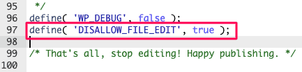 - Dodaj nad nią: define( ‘DISALLOW_FILE_EDIT’, true );